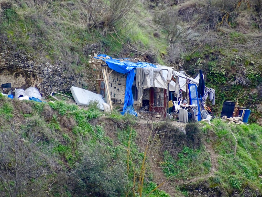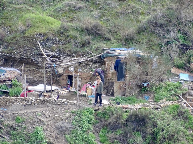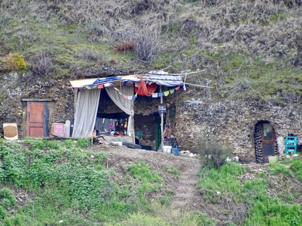 Ilmeisesti luola-asuntoja louhitaan vielä nykyisinkin. Vastakkaisella rinteellä näimme selvästi uudempia rakennelmia. On tämä aika rankka tapa rakentaa itselleen koti. Ensin pitää louhia seinämään suora osuus fasadiksi, sitten kiinnittää siihen kaari oveksi ja sen jälkeen louhia niin paljon sisätilaa kuin on mahdollista ja tarpeellista. Näitä oli paljon.