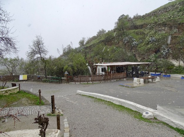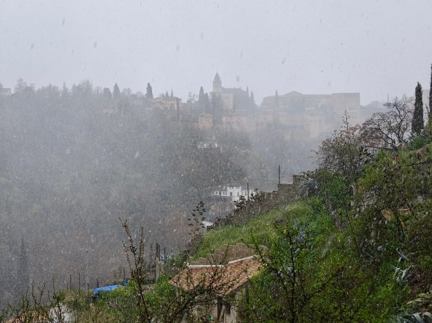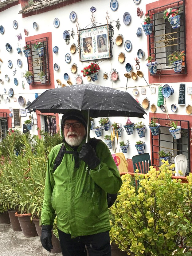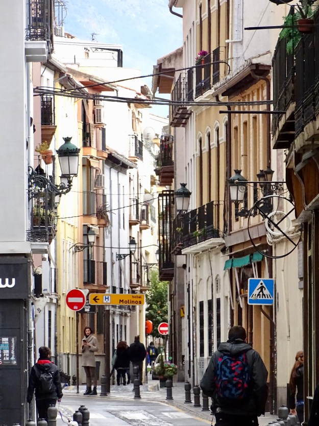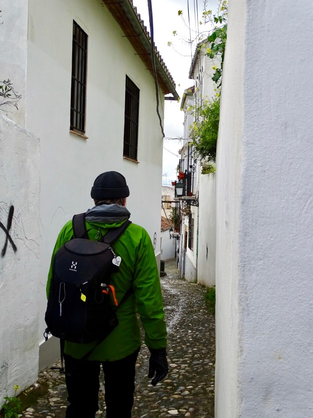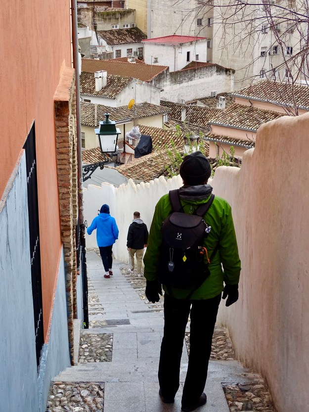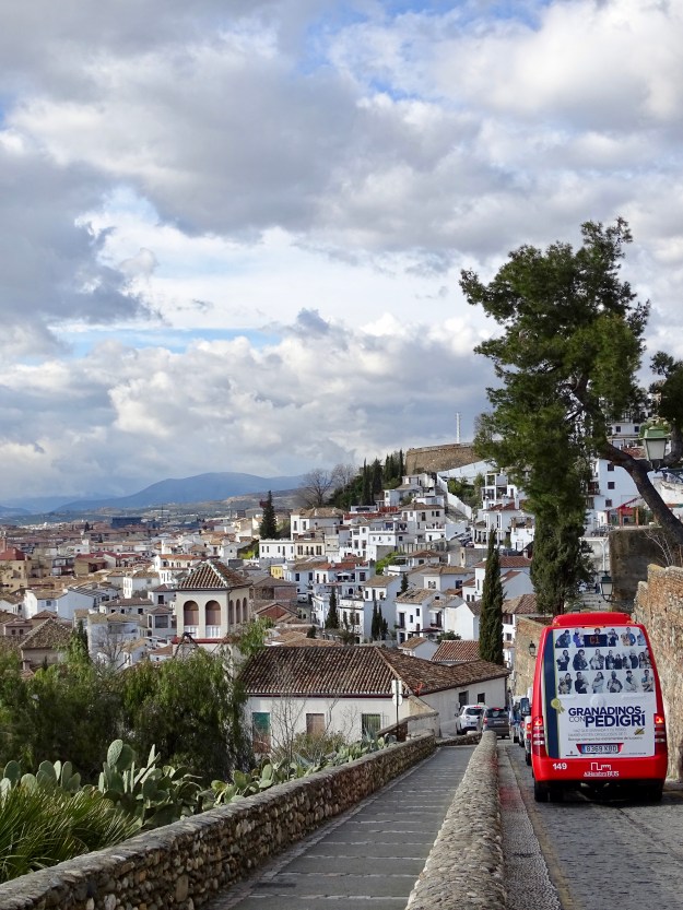 Ja se taas ei yllättänyt, että räntäsade vaihtui aika pian auringonpaisteeseen. Kohta olimme taas alempana Carretera de Sacromontella, jossa autot kulkivat kapeaa katua toisiaan väistellen ja jalankulkijat siinä seassa.