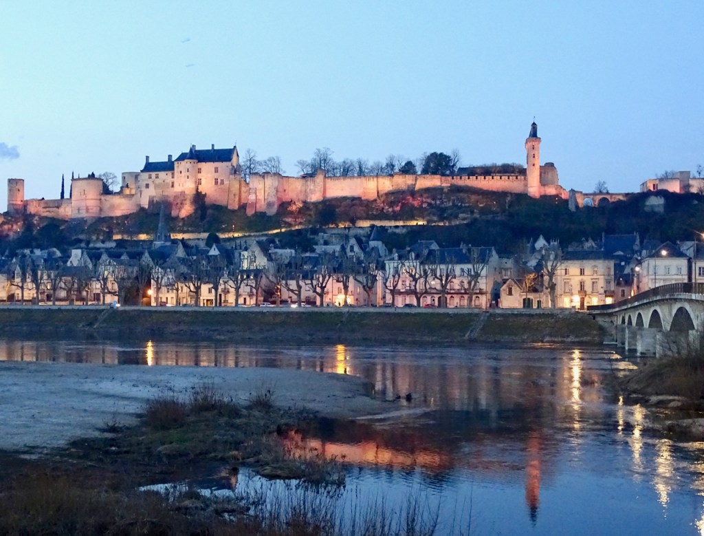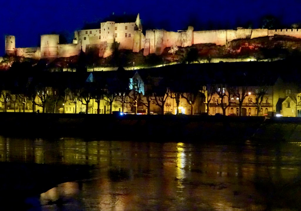 Chinonin linnan vieressä oleva joki ei ole Loire vaan sen sivujoki. Linnaa ja jokiympäristöä ehdimme katselemaan iltakävelyllä. Ensin linna juuri ennen auringon laskua.