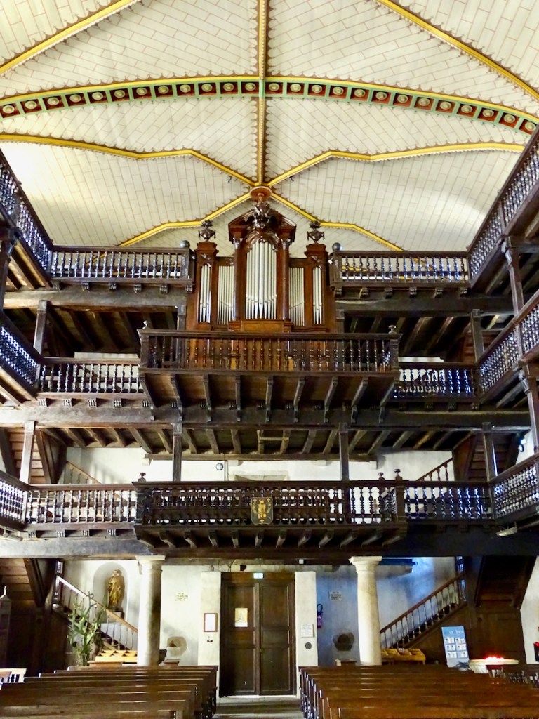 Jokaisen kylän kirkko oli sisältä tämän näköinen. Seiniä kiersivät parvekkeet ja puiset portaat usein juuri näin, kolmessa kerroksessa.