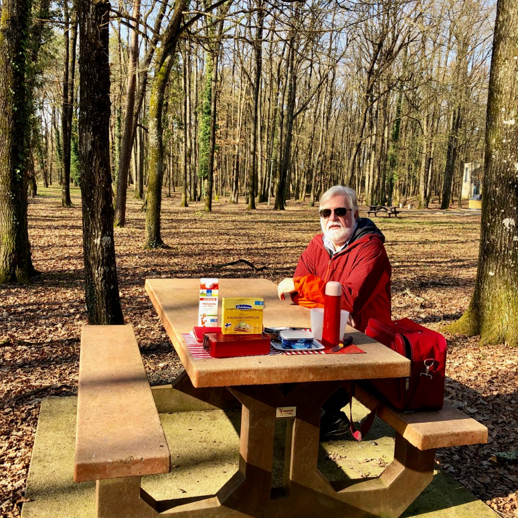 Kevät alkoi jo mukavasti näkyä. Katettiin kahvit keskelle metsää levähdyspaikalle. Ranskan moottoriteiden levähdysalueet ovat yleensä hyvin varustettuja. Kaikki eivät toki ole näin metsäisiä, mutta esimerkiksi täälläkin oli vessat, vaikka muuten metsässä oltiinkin.