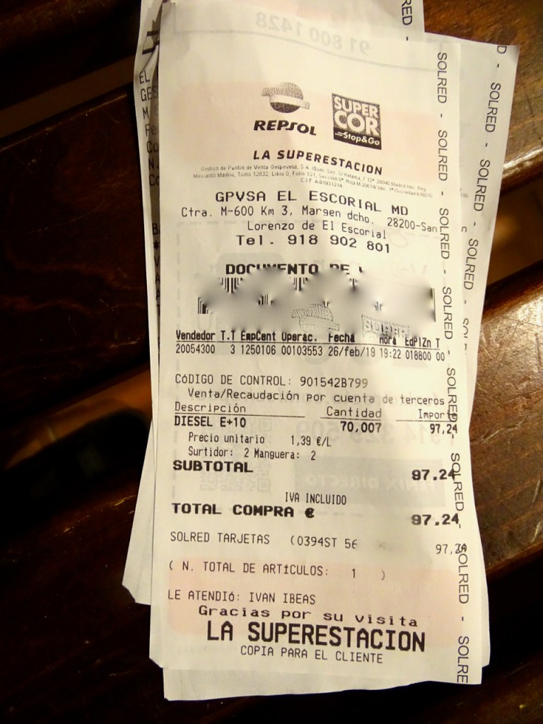 Ja pitkän päivän päätteeksi haimme auton parkkihallista ja lähdimme ulos kaupungista samalla silmäillen lähintä mahdollista huoltoasemaa. Segovian ja San Lorenzo El Escorialin välillä ei kuitenkaan ollutkaan ainuttakaan ja loppumatkalla teimmekin työnjaon: Juha ajoi varovasti ja minä rukoilin kaikin voimin. Yhteistyömme toimi, varsinkin kun viimeiset viisi kilometriä oli kohtuullista alamäkeä. Kurvasimme huoltoasemalle ja kuitista näkyy, että 70 litran tankkiin meni 70,007 litraa. Joskus menee jännäksi.