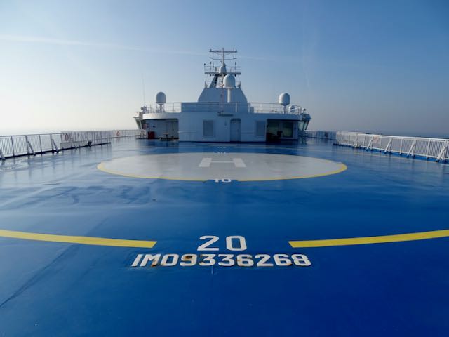 Finnladyn aurinkokansi näyttää houkuttelevalta, mutta ei ihan sentään. Merellä aina vähän tuulee. Kesäajalta meillä on kyllä kokemuksia siitäkin, että tällä kannella istutaan ja rentoudutaan, mutta helmikuu Vuosaaren satamassa on aina helmikuu.