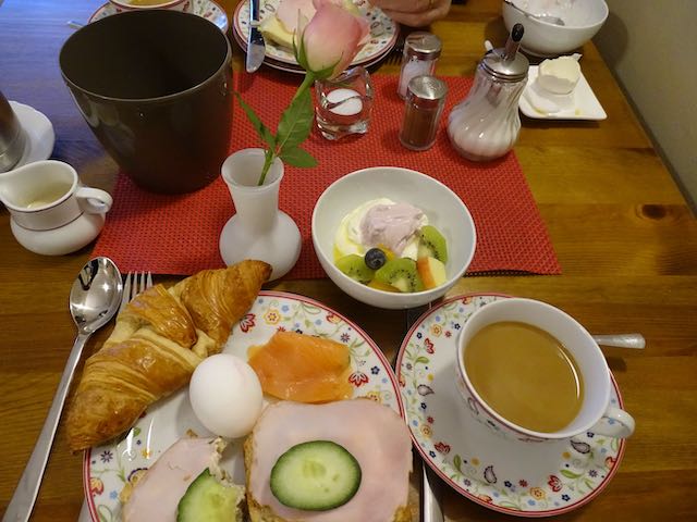 On mukava jatkaa matkaa tämän aamiaisen varassa. Munia, lohta, kinkkua, vihanneksia, juustoa, muroja, jugurttia, hedelmiä, kahvia ja leipää. Minulta ei ainakaan puutu mitään.