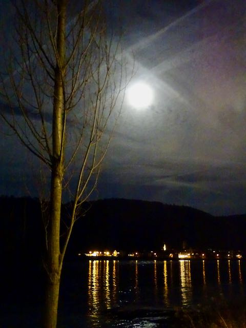 Viimeksi täällä ollessamme suunnittelimme, että seuraavalla kerralla tulemme iltapäivällä, teemme rauhallisen kävelylenkin Main-joen rannalla ja ihailemme auringonlaskua vastarannalle. Se maantielle levinnyt rekka muutti suunnitelmat, ja iltalenkkimme oli tunnelmallinen kuutamokävely.