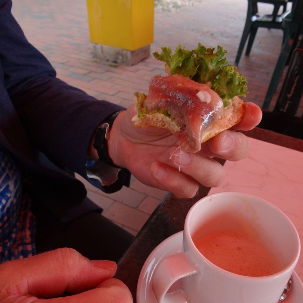 Glückstadtin kulinaristinen erikoisuus on silli. Täällä järjestetään sillifestivaaleja ja jokaisen kuppilan listalla on jotain silliin liittyvää. Juha päätti kokeilla leipää, jossa oli päällä kaksi sillifilettä. Minä sain sen toisen. Joo, ihan kiva, mutta en ehkä tänne pelkästään tämän ruoan takia tulisi. Tai sitten pitäisi kokeilla vielä lisää.
