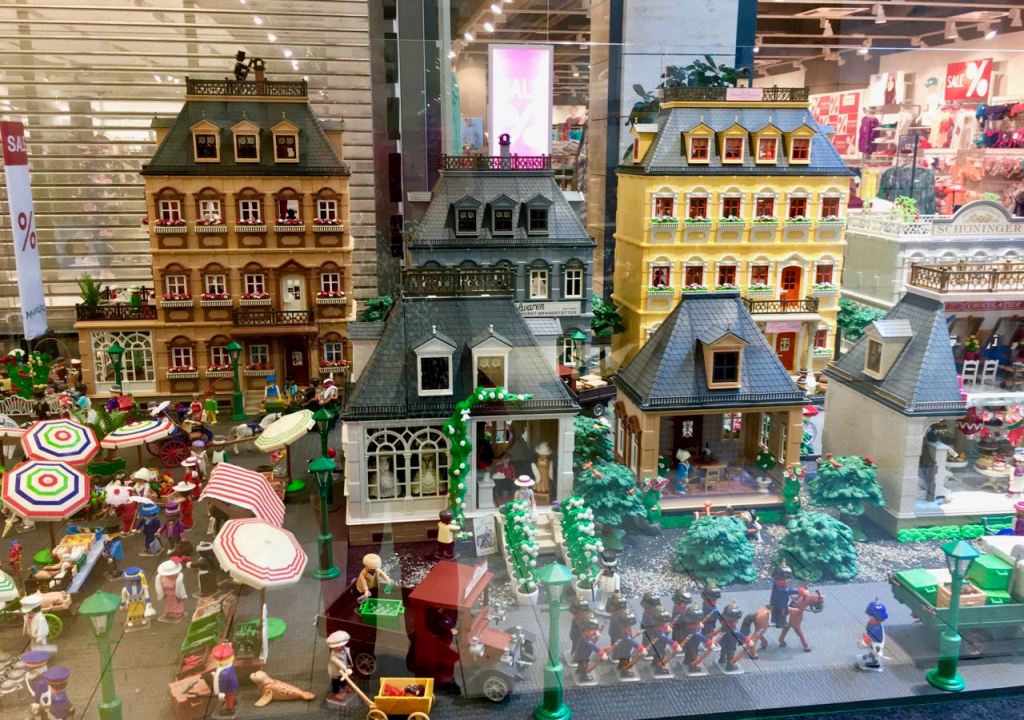 Koko ostoskeskuksen ala-aula oli silloiin täynnä isoihin vitriineihin tehtyjä asetelmia. Joissain oli leluja tai satuaiheita, näissä paremminkin näkymiä. Katunäkymä ja lentokenttä. Cittimarktissa on näitä joskus, ei aina.