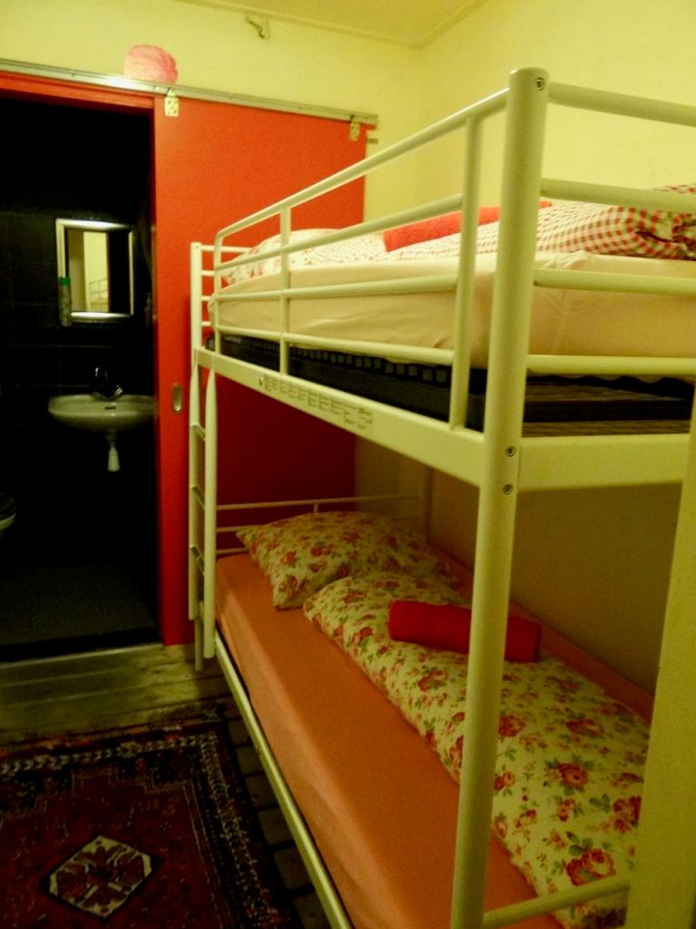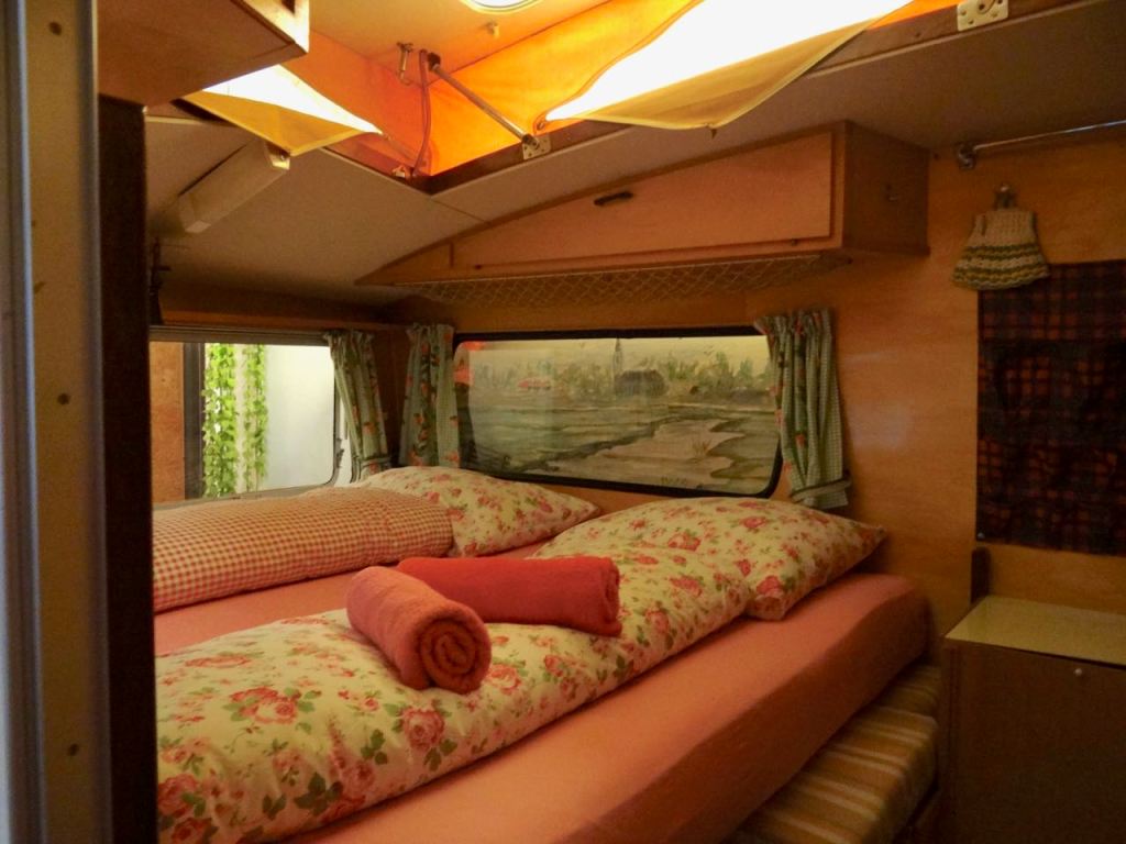 Miten jollekin voi tulla mieleenkään perustaa leirintäalue sisätiloihin ja tuoda sinne vanhoja asuntovaunuja nukkumapaikoiksi! Me olimme onnistuneet varaamaan itsellemme ihan oman yksityisen paikan, jossa vaunu oli oleskelutilassa, sen lisäksi oli yksityinen keittiö, lapsille tarkoitettu toinen huone kerrossänkyineen ja tietysti oma vessa ja suihku. Sellaisenkin majoituksen olisi voinut varata, jossa kolme vaunua olisi jakanut ”leirintäalueen” ja sen yhteiset tilat. Tämä majoitus maksoi 75€/yö.