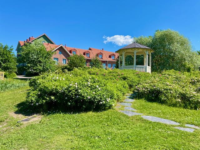 Kartanonkosken alueella on helppo pyöräillä. Suuntasimme sen keskelle Illen puistoon, jonka keskellä on lasten leikkipaikka. Puisto näytti ihanalta. Keskellä ruusupensaita oli huvimaja ja lammen yli kulki puusiltoja. Oli jo vähän vaikea valita, mille mukavasti varjossa olevalle penkille nostelisimme eväät. Päädyimme pensaan varjoon lammen rannalle.