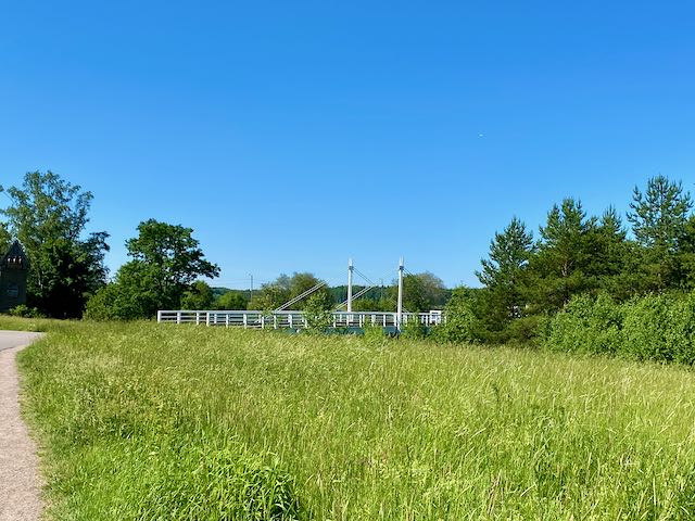 Ihan lähellä Electrobiken myymälää on Tammiston luonnonsuojelualue. Mukava pistäytymiskohde, mutta tällä kertaa ajoimme ohi. Ei aina viitsi parkkeerata ja kiinnittää pyöriä jonnekin pientä kävelyä varten. Kartanonkosken ja Haltialan väliä koristaa valkoinen puusilta. Varsin tuttu paikka meille monilta pyöräretkiltämme.