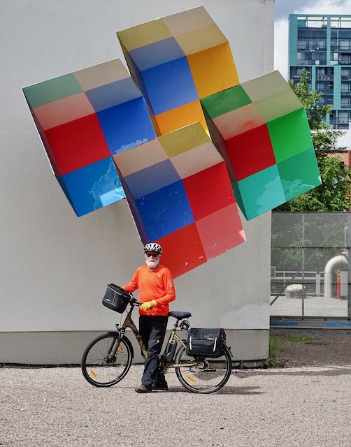 Sitten teimme pienen piston tarkoituksella pois lyhimmältä reitiltä. Olimme jo kahtena edellisenä päivänä valinneet sadepäivän vierailukohteeksi Fazerin vierailukeskuksen ja nyt oli oiva tilaisuus ottaa selfie sen edessä pyörien kanssa. Paikka oli jo kiinni, joten saimme rauhassa leikkiä kameran itselaukaisijalla.