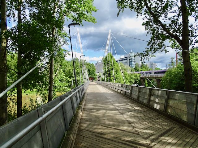 Puistossa oli myös pienen sillan takana alue, jolla oli kutsuvasti pari penkkiä, mutta sen olivat huomanneet jo jotkut muutkin, joten etsimme itsellemme toisen penkin ja kaivoimme loput eväät esille. Tässä maisemassa kannatti todellakin viettää hetki ja sulatella pyöräretken kokemuksia.