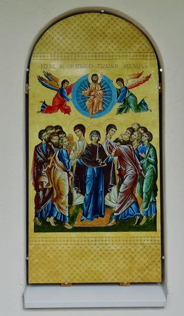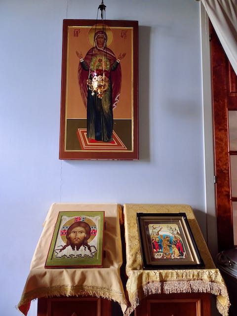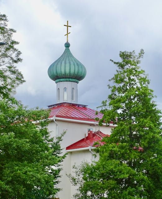 Kirkko on Tikkurilan ortodoksinen kirkko. Pysähdyimme hetkeksi sisäpihalle ja yllätykseksemme ovikin oli auki. Kirkko oli kuitenkin remontissa, joten sinne pääsi kurkistamaan vain sivuhuoneeseen, jonne ilmeisesti oli remontin alta siirretty esineistöä.