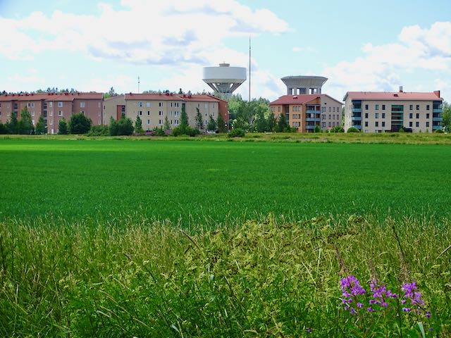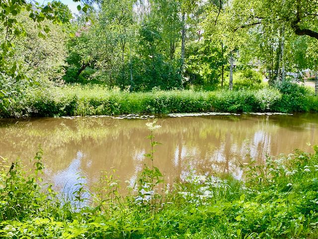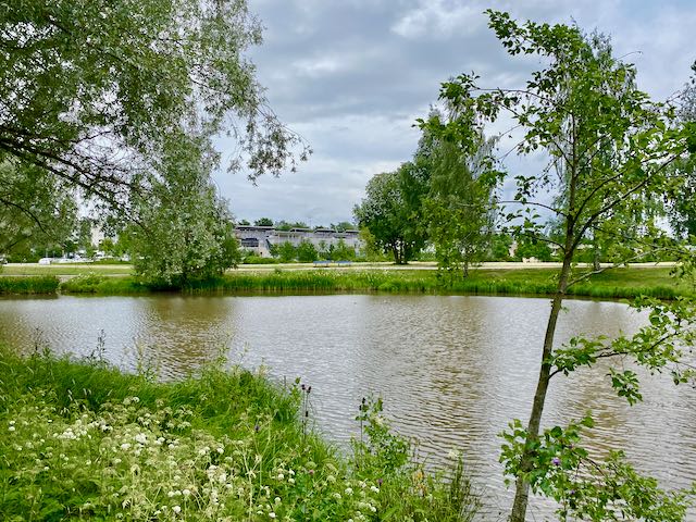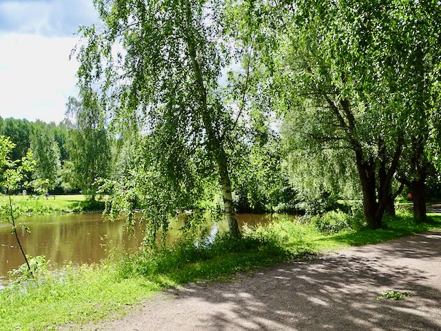 Simonkylästä löysimme taas yhden eväshetkihelmen. Ristisillan puisto ja sen lammet olivat niin kaunis ympäristö, että emme olisi malttaneet lähteä niin kiireesti eteenpäin kuin uhkaavat pilvet vaativat. Puiston takana näkyy Hiekkaharjun vanha vesitorni.