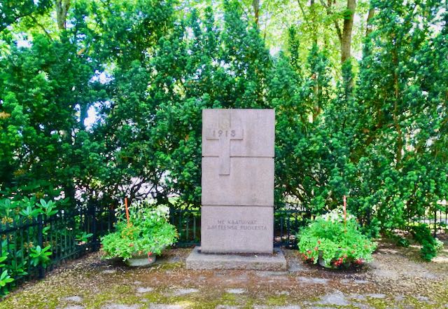 Hiekkaharjun aseman jälkeen käännyimme Jokiniemen suuntaan Urheilutielle. Urheilukeskusta vastapäätä kadun toisella puolella on Vantaan Punaisten muistomerkki. Se on pystytetty tänne 1946, koska Tikkurilan taistelut punaisten ja valkoisia auttamaan tulleiden saksalaisten välillä käytiin juuri tällä alueella. Saksalaiset onnistuivat siinä, mitä halusivatkin, eli katkaisemaan junayhteyden Helsinkiin ja punaisia kuoli kuutisen kymmentä. Osan jäännöksiä on löytämättöminä juuri tässä mäntymetsässä.