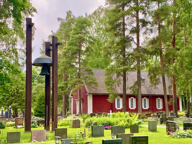 Punainen hirsikappeli on tunnelmallisen näköinen ja sen edessä on muualle haudattujen muistomerkki ja pieni sankarihautausmaa ja lähellä myös mielenkiintoinen kellotapuli.