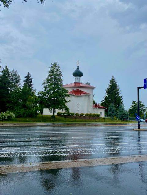 Ja niinpä siinä sitten kävi niin, että sadekuuro ehti kastella sekä meidät että kadut. Hetkeksi pysähdyimme puun alle pahimmassa sateessa ja siitä otin kuvan Vantaan ortodoksisesta Kristuksen taivaaseen astumisen kirkosta.