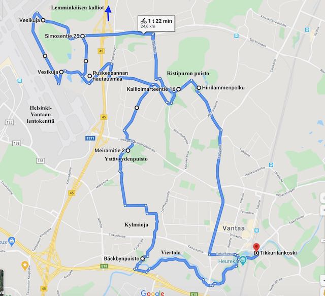 Tämän jälkeen pyöräilyyn tuli parin päivän sadetauko, mutta jatkoimme tästä, tulimme uudelleen Tikkurilaan ja aloitimme siitä, mihin olimme jääneet. Tässä kuitenkin sitä ennen tämän päivän pyöräilyreittimme.