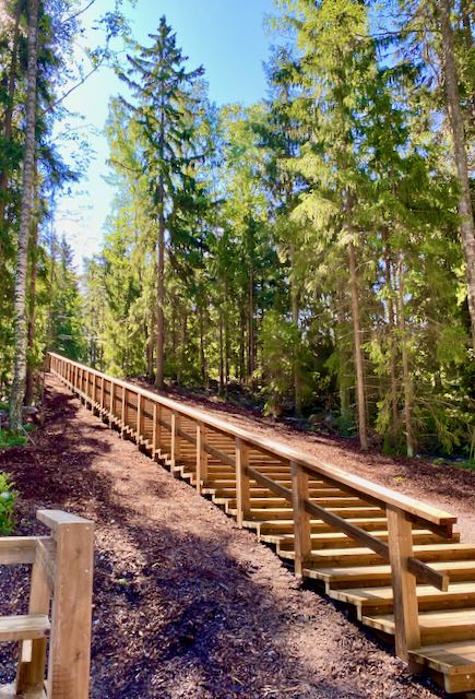 Hiekkakentän vieressä oli houkuttelevat kuntoportaat. Oli houkutus tehdä ensimmäinen mutka heti saman tien, mutta pystyin välttämään sen. Ajattelin, että jos tekee kovasti mieli, niin takaisin tullessakin voi tuon suorittaa.
