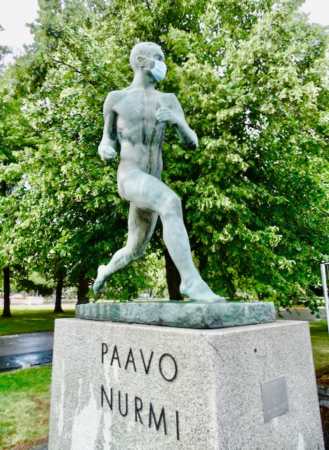 Nyt tarjoutui kuitenkin hyvä tilaisuus lähteä Olympiastadionille ihan vain turistina, ilman mitään urheilunäkökulmaa. Stadionin nelivuotinen remontti on valmis ja sinne oli uteliailla vapaa pääsy tämän viikon. Poikkeusoloihin tietysti liittyy se, että vapaaliput oli ”ostettava” etukäteen (lippu.fi). Poikkeusolot näkyivätkin paikan päällä henkilökunnan naamioitumisesta maskien taakse. Maski oli myös Paavo Nurmella, joka 1952 olympialaisiin juoksutti olympiasoihdun.