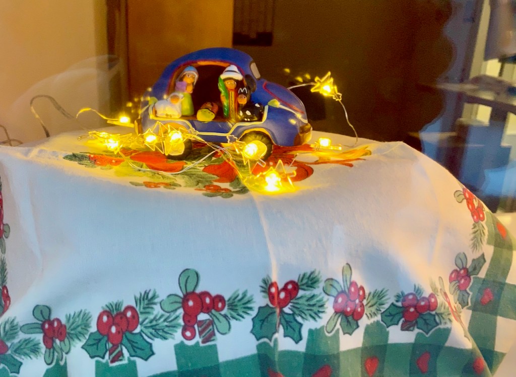 Joosef, Maria ja Jeesuslapsi lähtivät mukaamme Toledosta, kun emme saaneet silmiämme irti lapsuuden muistot mieleen tuovista hahmoista huivit päässään. Ihan kuin koulujen joulukuvaelmissa. Heidän takanaan on appeni Israelista tuoma öljypuinen rakennus tähtineen.