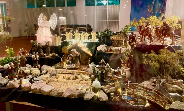Kirkon aulaan on rakennettu seimi tai seimeen liittyviä asioita kolmelle pöydälle. Yksi näistä on meidän rakentamamme jouluseimi espanjalaiseen tapaan, enimmäkseen myös espanjalaisin tavaroin.