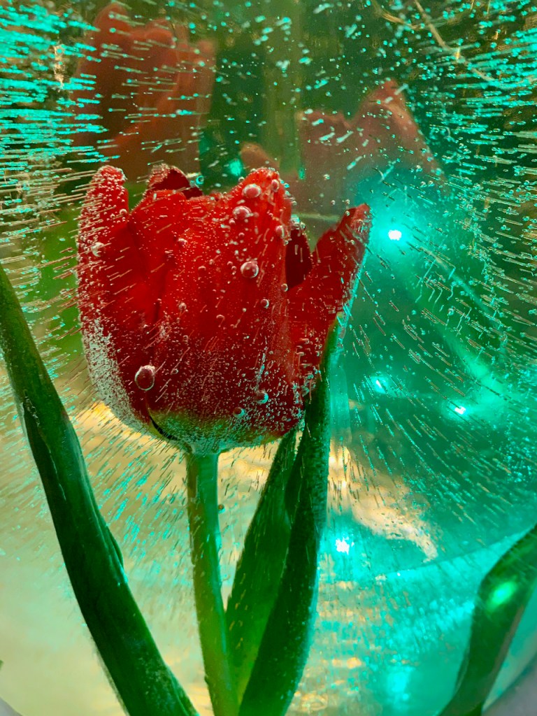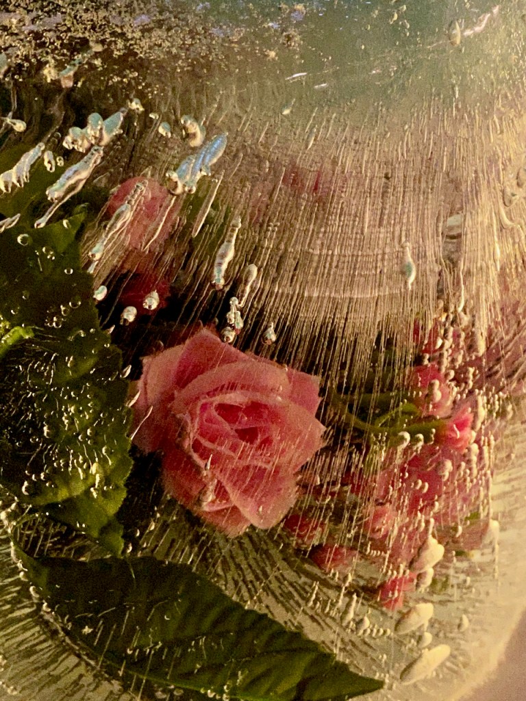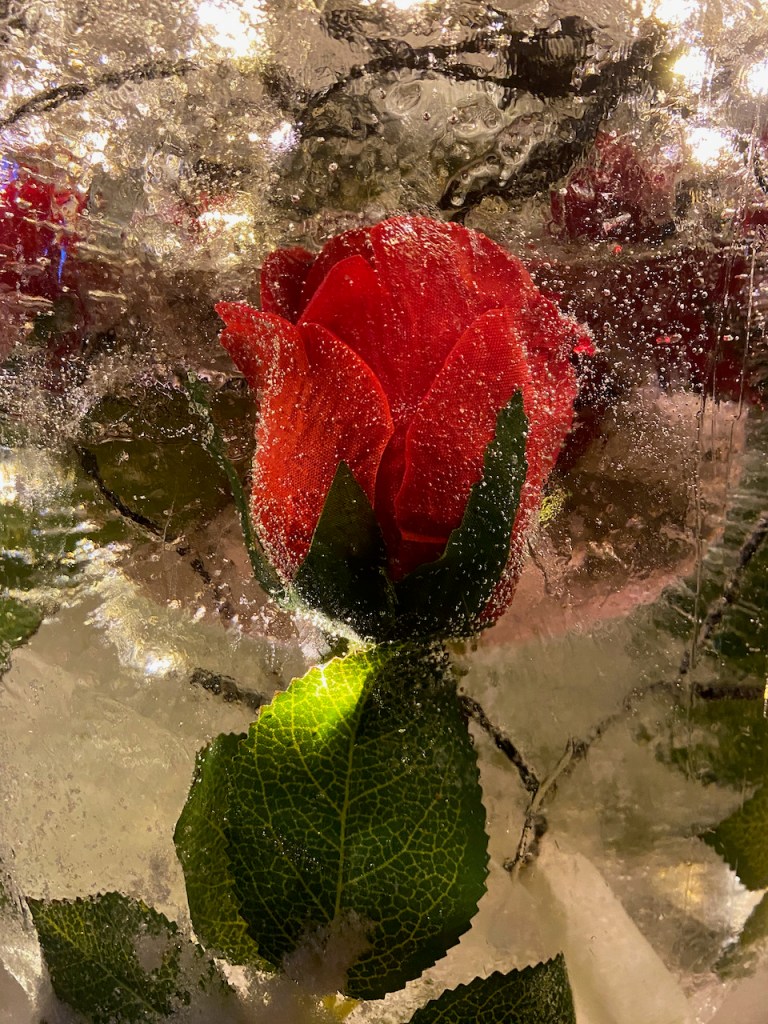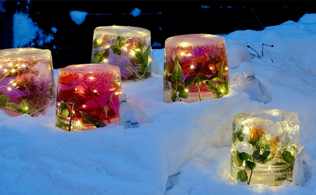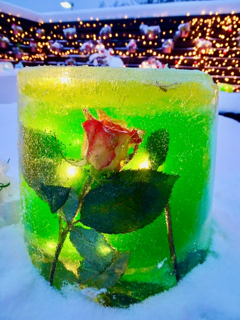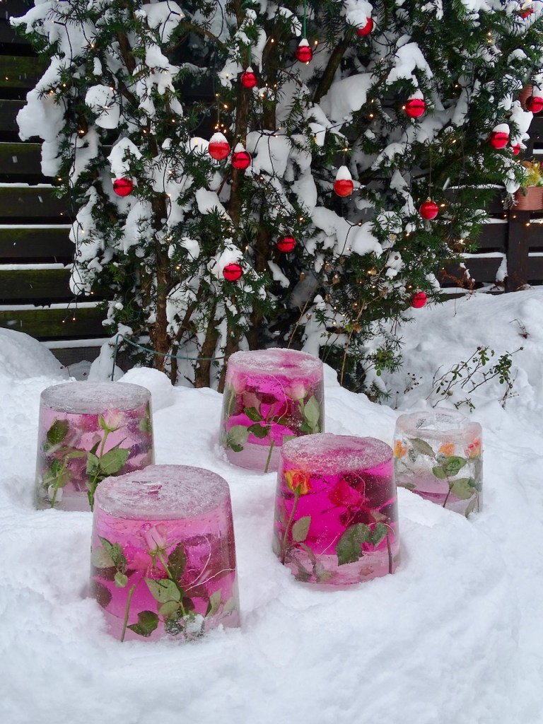Tammikuun pakkaset toivat idean tehdä hankeen muutama jäälyhty. Reilun kaupan ruusukimppu jäädytettiin lyhtyjen sisään.