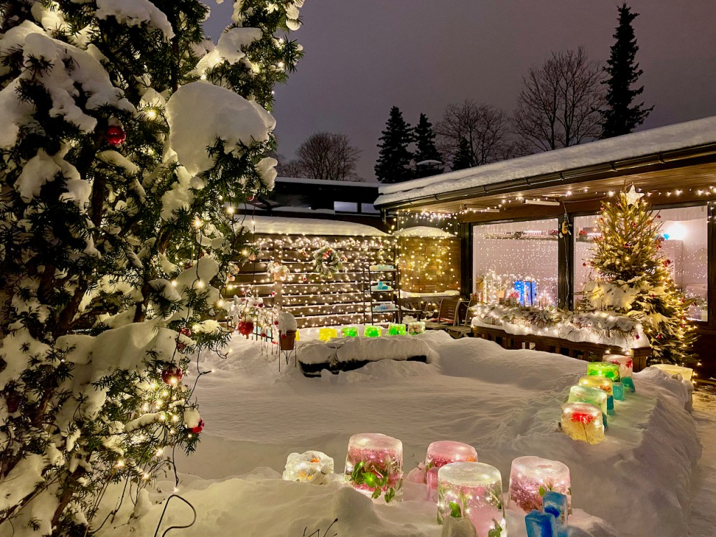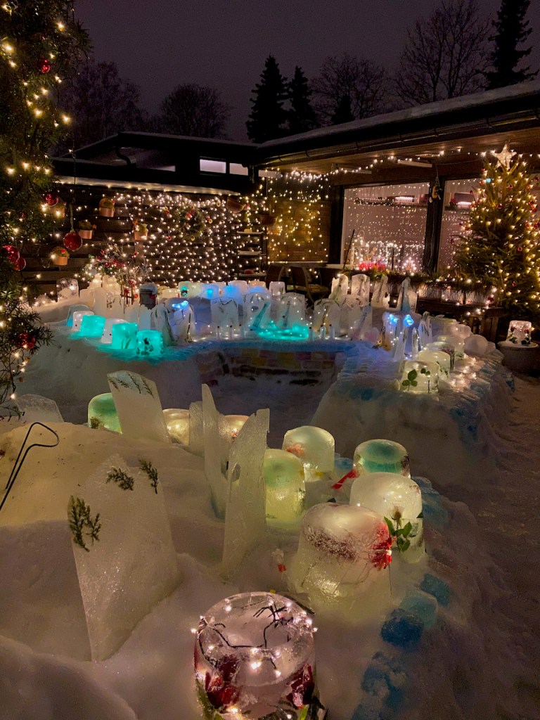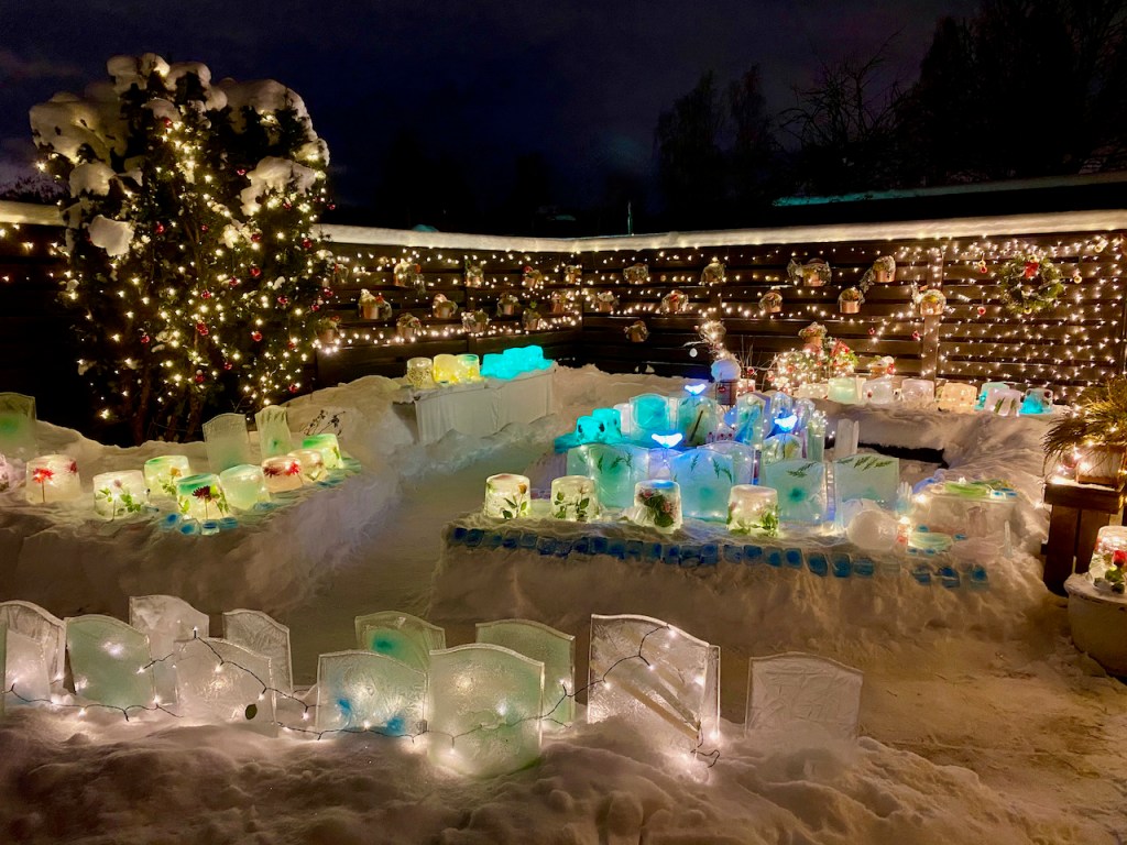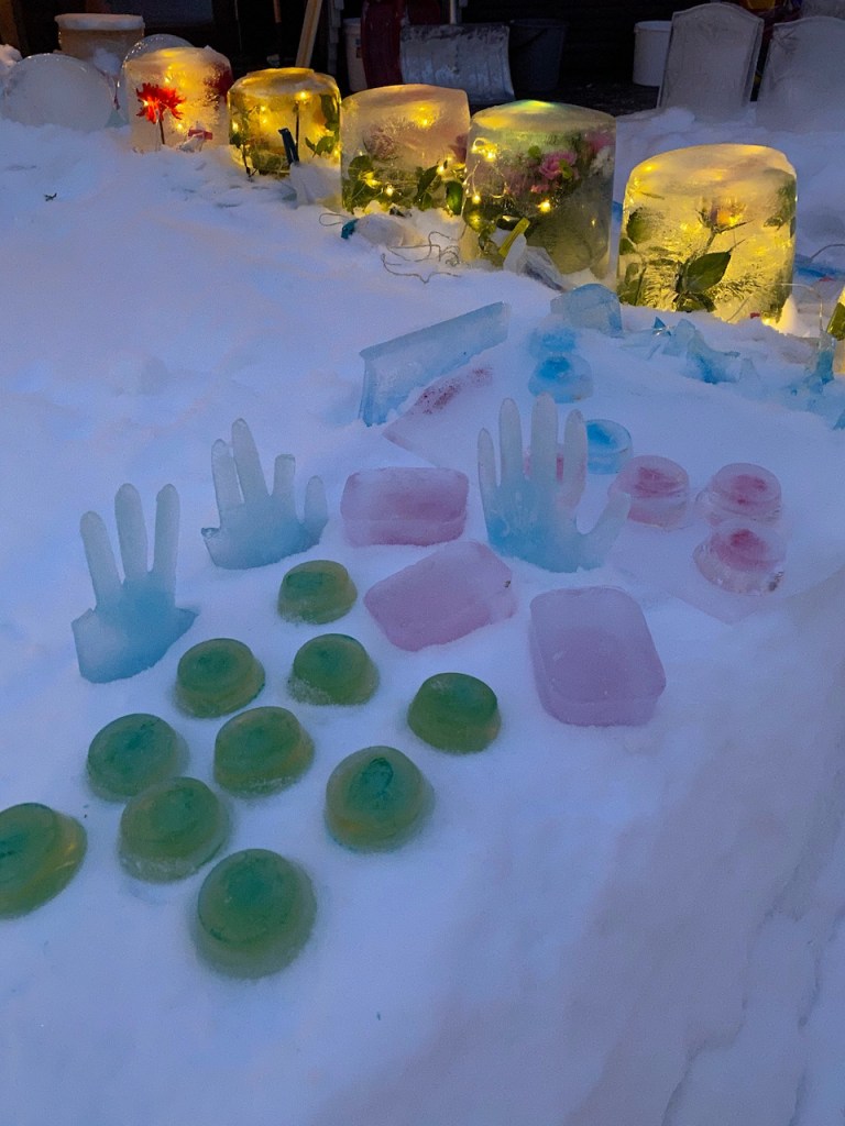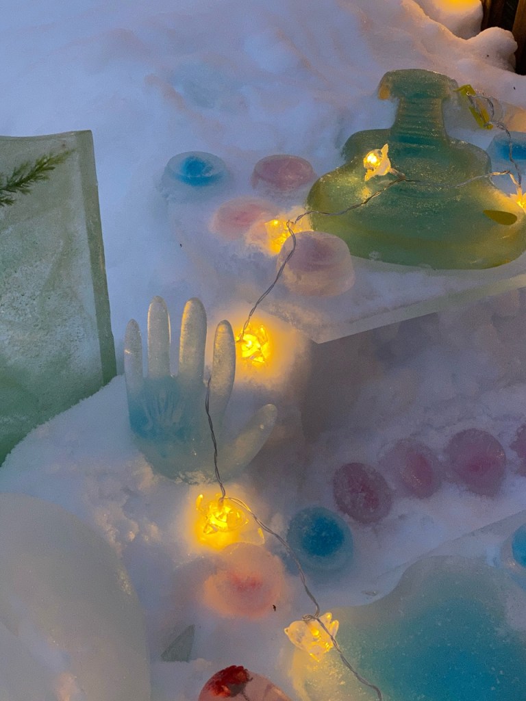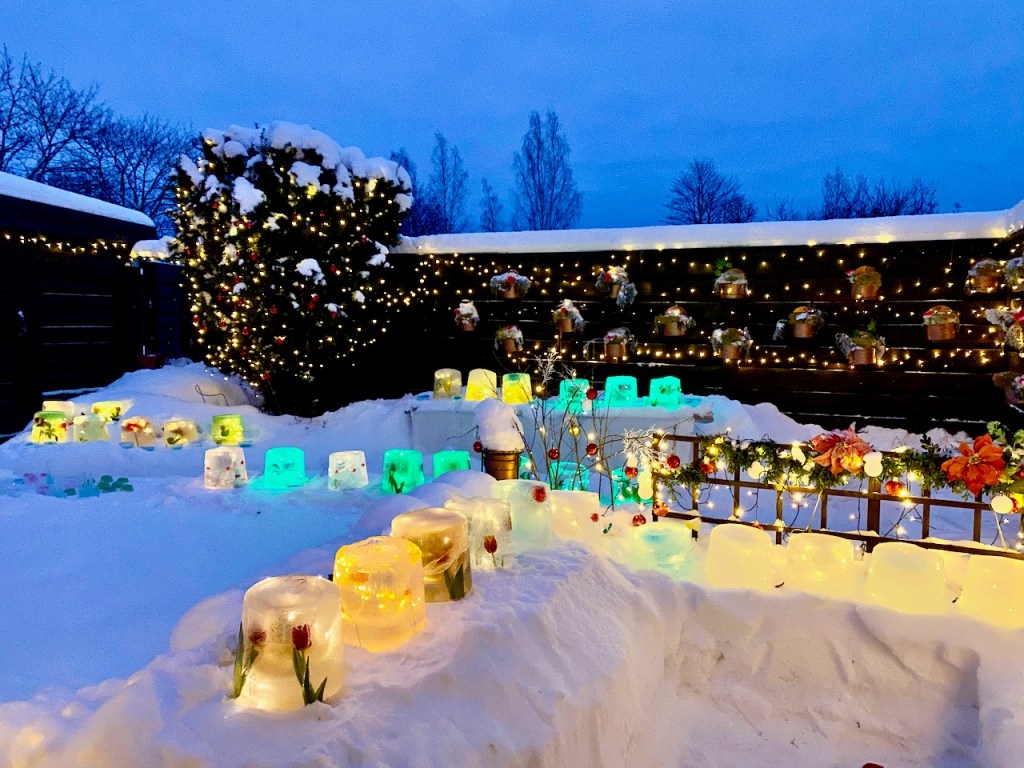 Pihan jäätaide levisi joka päivä ja pihasta muodostui ihana paikka tavata ystäviä monen metrin etäisyydellä, värejä ja valoja ihaillen ja kuulumisia vaihtaen. Tämä oli ehdottomasti ihanin asia koko jääprojektissamme.