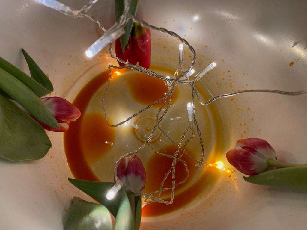 Ämpärien reunoja vasten teipattiin eläviä tulppaaneja ja ruusuja ja myös tekokukkia.