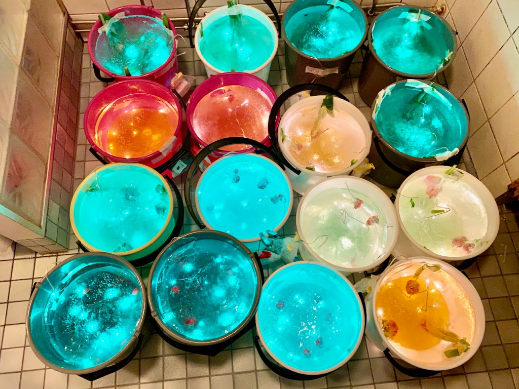 Ämpärit olivat taas tyhjinä, jotkut kaupat myivät pattereilla toimivia led-valonauhoja puoleen hintaan, ja alkoi näyttää siltä, että pihalle mahtuisi valoa, väriä ja jäätä enemmänkin. Kylppärin lattialla kokeiltiin valojen toiminta ja sitten vietiin ämpärit ulos jäätymään. Homma alkoi vähän lähteä lapasesta.