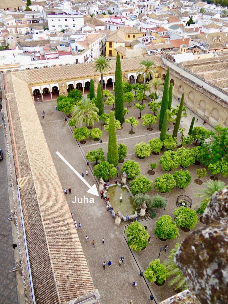 Cuando visitamos Górdoba la primera vez, no tuve tiempo de subir a la torre de la Catedral, pero hoy quería hacerlo. Así que pasamos por delante de las tiendas de souvenirs, andamos hasta la catedral y entramos en el jardín de la Mezquita y la Catedral.