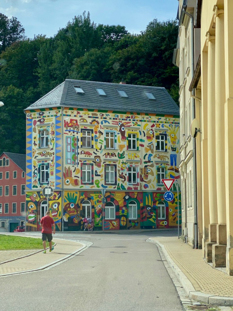 Sebnitz oli majapaikkaamme lähin pieni kaupunki. Majoittajamme sanoivat, että tämä noin 10 kilometrin päässä ollut paikka oli myös lähin ruokakauppa. Niin olikin, sieltä löytyvät Kik, Lidl ja Spar ja niiden lisäksi tori, kahviloita, muutama ravintola, ja vähän isompia rakennuksia. Teimme kävelyn sielläkin ja viimeisenä päivänämme isäntäväkemme saattoi ystävällisesti Juhan sinne heidän itse varaamaansa hammaslääkäriin, kun Juhalta oli lohjennut paikka hampaasta. Tällaisia näkymiä: