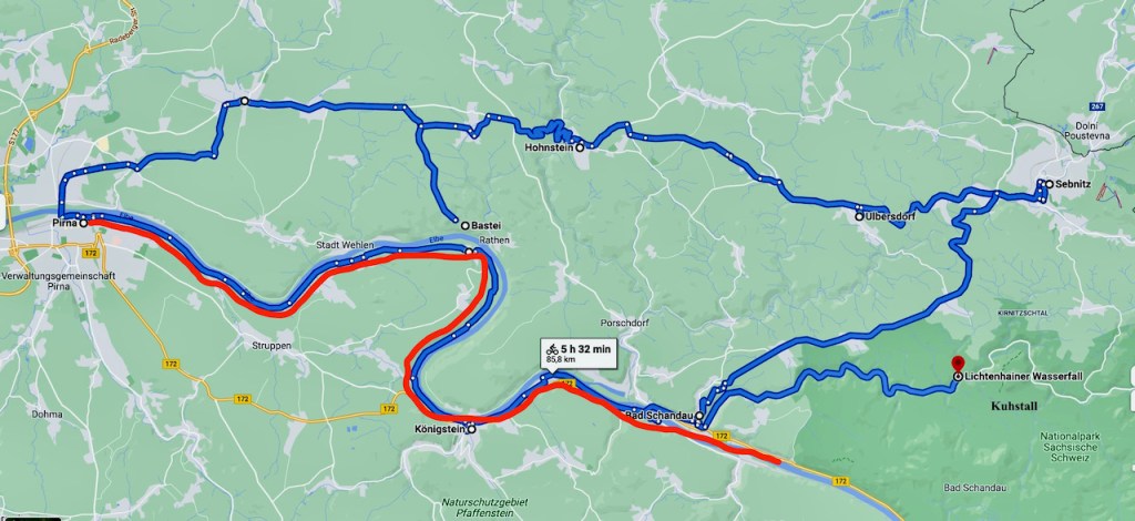 Saksin Sveitsi oli ollut haaveissamme jo pitkään ja olisi siellä ollut vielä enemmän nähtävää kuin mitä kolmessa päivässä ehdimme edes nähdä. Ehkä pitää mennä uudelleen? Ja suosittelen tätä kohdetta erityisesti sinulle, joka olet innostunut vaeltamaan metsissä ja rinteillä. Se puoli jäi meiltä turhan vähälle. Laitan tähän vielä kartan, josta näkyvät ne paikat, jotka tekstissä mainitaan. Ja kartassa punaisella merkitty Elben ranta on se, jota pyöräilimme parina päivänä.