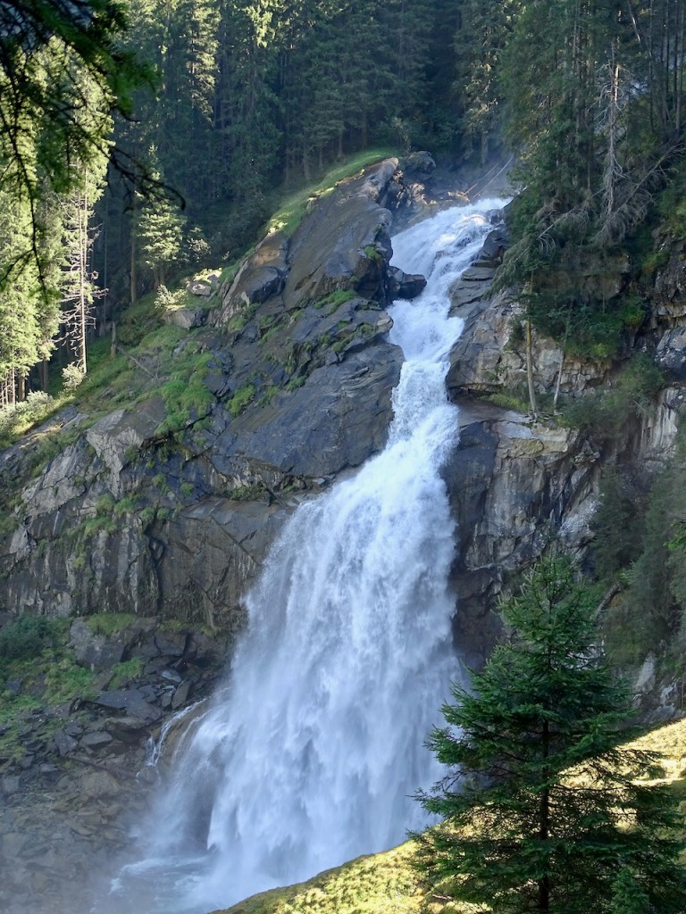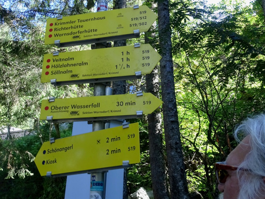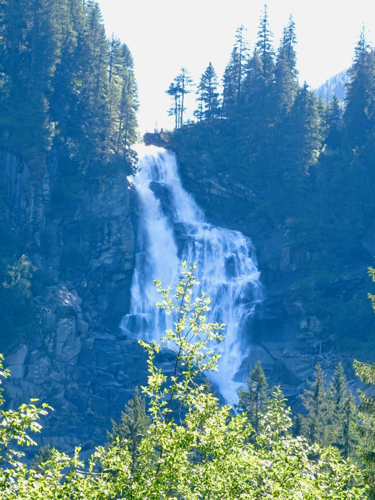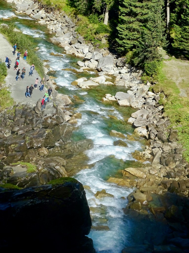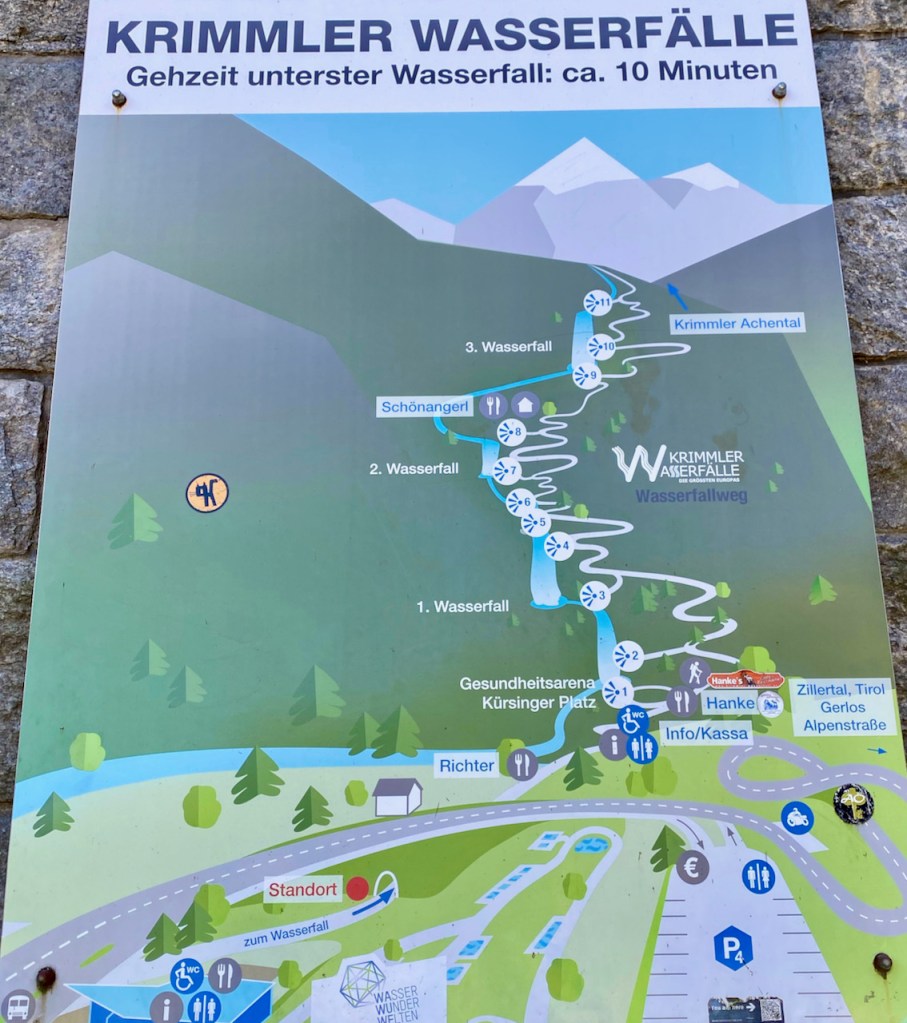 Reitti putousten alapäästä niiden yläpäähän on noin 4 km ja se on luonnollisesti nousujohteista. Hyvää jalkatreeniä siis! Tästä linkistä pääset Krimmler Wasserfälle sivuille, jossa on kuvausta tuosta reitistä. Putousten alapäähän matkaa lähimmältä parkkipaikalta on joitain satoja metrejä, maksimissaan kilometri ja siellä kerätään tuo muutaman euron pääsymaksu. Kävelyalusta on hyväkuntoista ja leveähköä polkua, joten sinne on helppo pääsy vaikka vähän nopeammallakin aikataululla, jos kuntoa riittää.