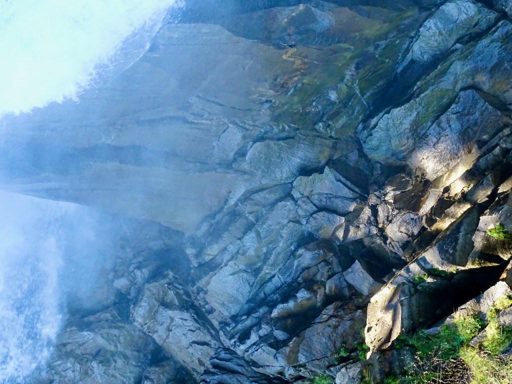 Putousten alapäässä on hyvä tasanne ja näkymä putoukselle. Siellä pääsee sekä kuulemaan että näkemään veden mahtavan voiman, kun se jylisee alas Alppien rinnettä. Tämä kivikko näytti olevan myös erilaisten selfien ottajien ja Instagram-kuvaajien suosiossa. Saimme odottaa kuvausvuoroa.