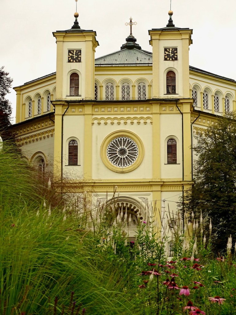 Pois ajaessamme näimme tien vieressä myös toisen mielenkiintoisen näköisen kirkon, jonka edessä näytti olevan turistiryhmä, joten ilmeisesti Mariánské Láznessa olisi muutakin nähtävää kuin tuo pylväskäytävä ja puisto, jossa kiertelimme.