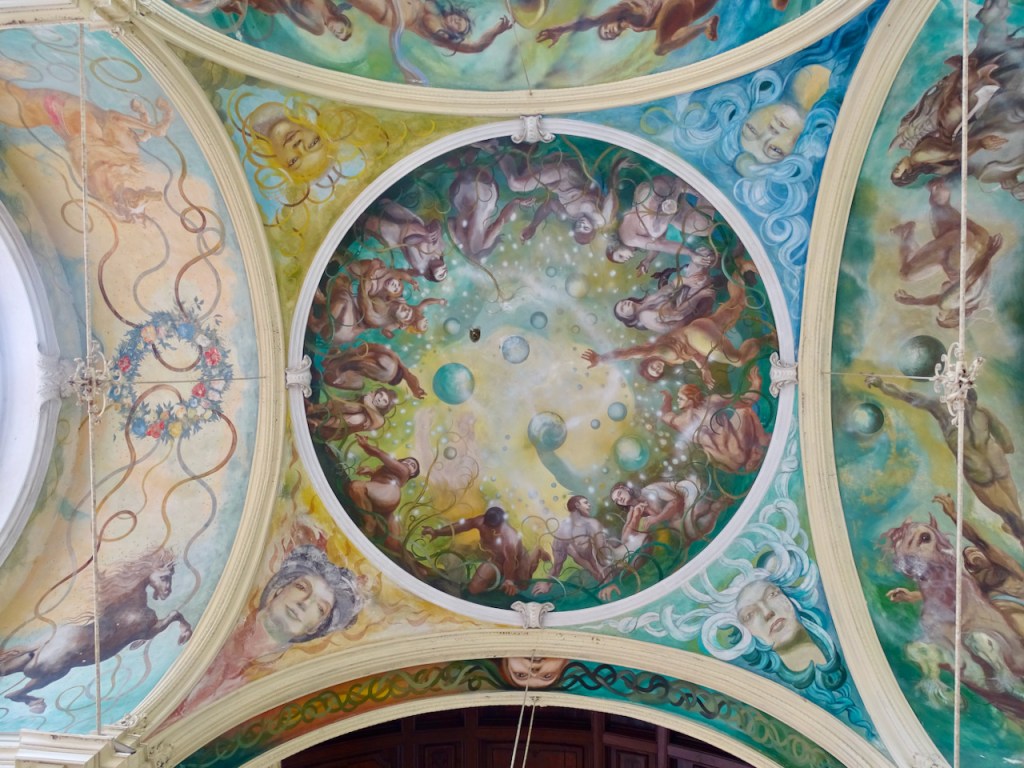 Pylväikön kattojen freskot kuvaavat ihmisen halua lentää.