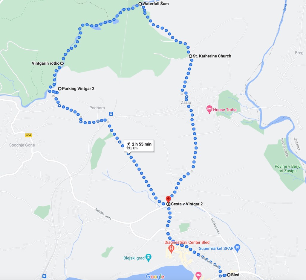 Vintgarissa kävelyä suosittelemme, se on niin vaikuttava. Ainoa miinus on ehkä se, että tosi moni muukin tietää sen olevan hyvä käyntikohde, eli sesonkiaikoina voi varautua siihen, ettei saa kävellä yksin. Tässä kartta kävelyreitistämme: