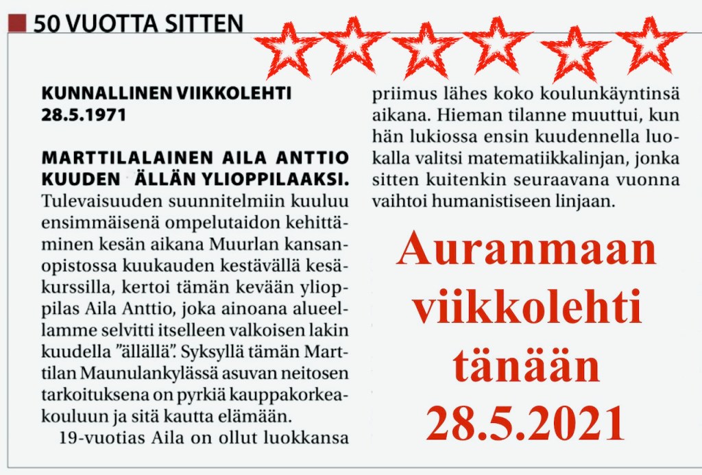 Ja muistan myös onnellisena ylioppilasjuhliani kotona. Olin kylän ensimmäinen ylioppilas ja samoin lähisuvun ensimmäinen. Sekin on muisto siitä, että siihen aikaan pienituloisen pienviljelijäperheen tyttären oppikouluun menokaan ei ollut mikään itsestäänselvyys. Hyviä tuloksia kannatti juhlia. Tänä keväänä kuulin, että samassa Maunulan kylässä sukulaistyttö oli kirjoittanut vielä pari ällää enemmän. Onnittelut!