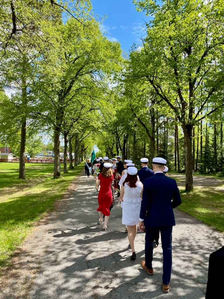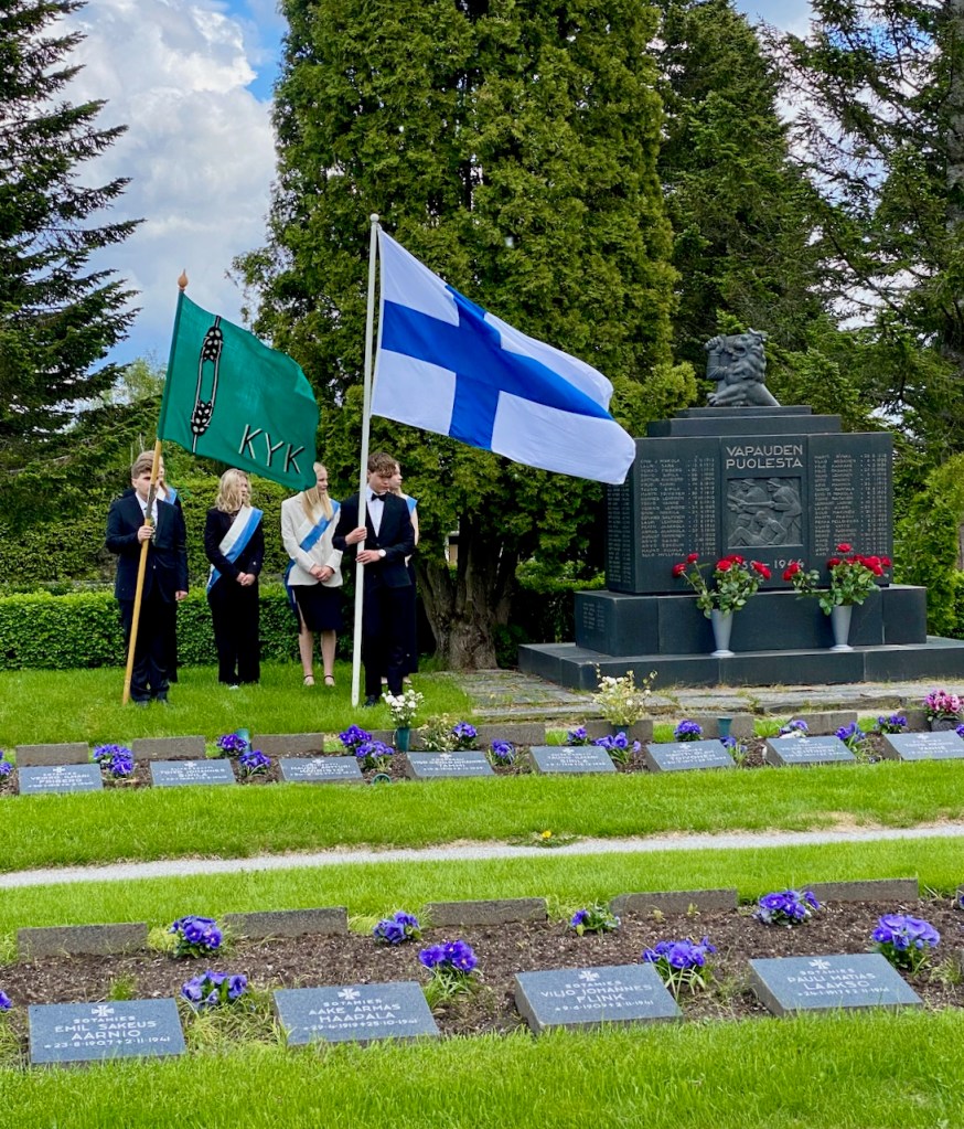 Juhla päättyi ja jatkui perinteiden mukaan. Kävelimme reippaasti lippujen ja uusien ylioppilaiden perässä reilun kilometrin matkan sankarihautausmaalle laskemaan kukat muistomerkille. Olemme sen ikäisiä, että monille meistä se toi muistoja isistämme, jotka olivat olleet rintamalla.