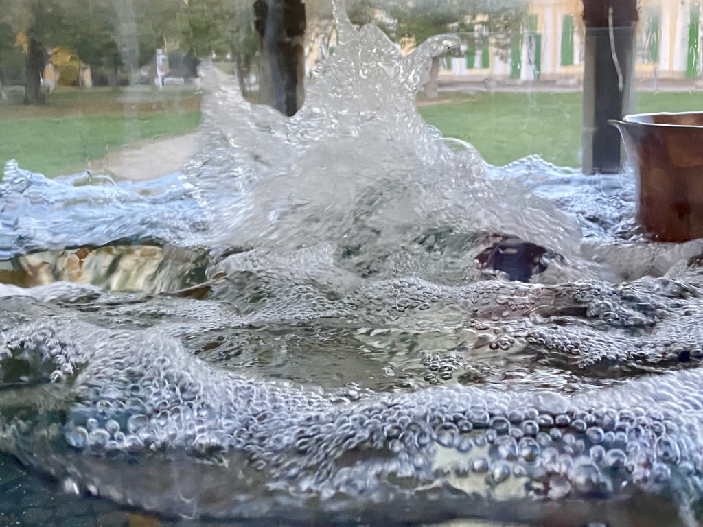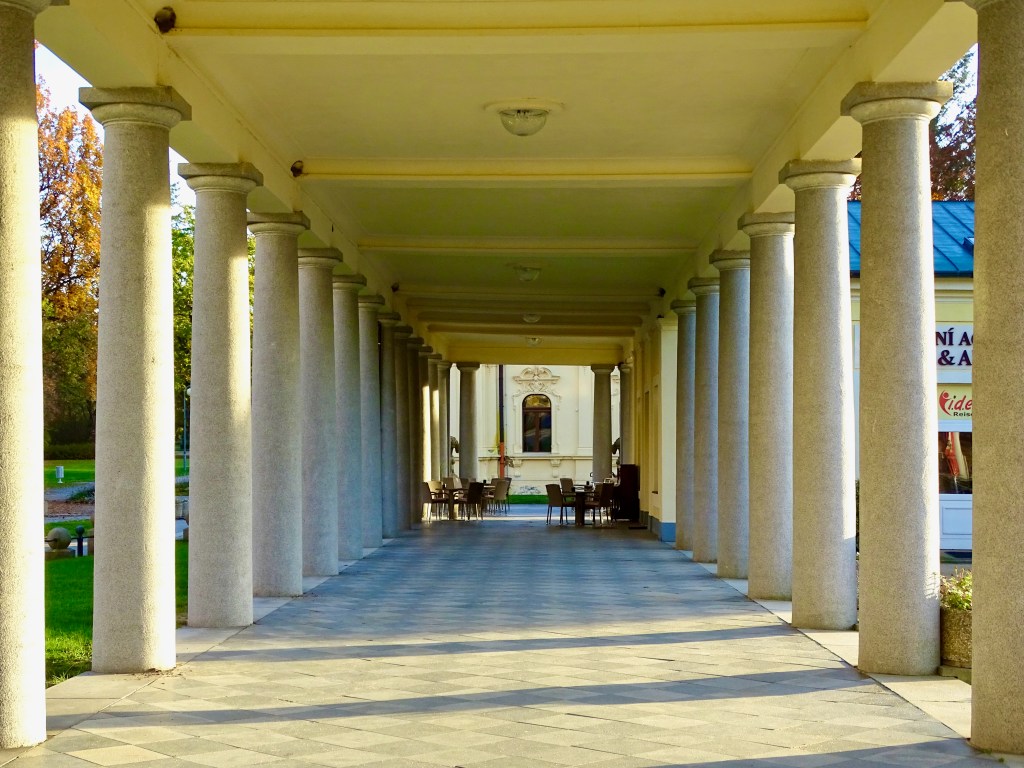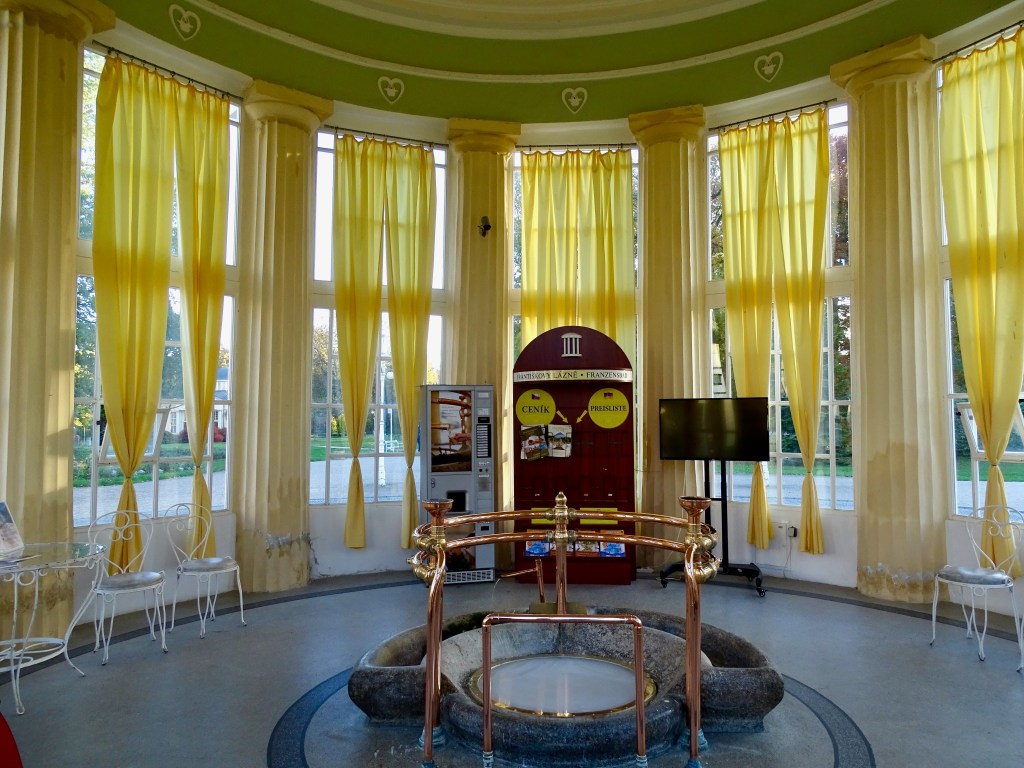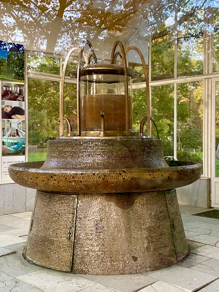 Kivennäisvesiä on kyllä mahdollista myös vain maistaa ihan helposti. Pylväskäytävissä ja katetuissa rakennuksissa on lähteitä, joista voi ottaa hanasta virtaavaa vettä itselleen. Karlovy Varyssa oli valtavasti matkamuistokojuissa myytävänä nokan sisältäviä mukeja vesien maisteluun, mutta täällä emme sellaista nähneet, ihmiset ottivat vettä juomapulloihin. Vesi on hyvin voimakkaan makuista ja vaikuttaa ruoansulatukseen ja aineenvaihduntaan. Näin olemme lukeneet, emme kokeilleet tällä kertaa. Ja taisimme olla jo turistisesongin ulkopuolella, koska kaikissa katoksissa ei lähde enää ollut avoinna.
