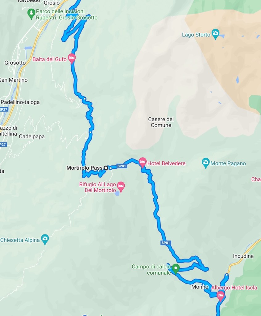 Emme ole koskaan tällaisesta solatiestä kuulleet, mutta olipa hauska yllätys ja ilman muuta kannattaa ajella, jos matkan varrelle sattuu. Meille sattui ajaessamme Stelvion solasta Bormion kautta Lago di Iseolle. Tie käännytään siis ennen Vernugaa tieltä SP27 ja Mortirolon vuoren ylityksen jälkeen jatketaan Monnon kautta Edonoon.