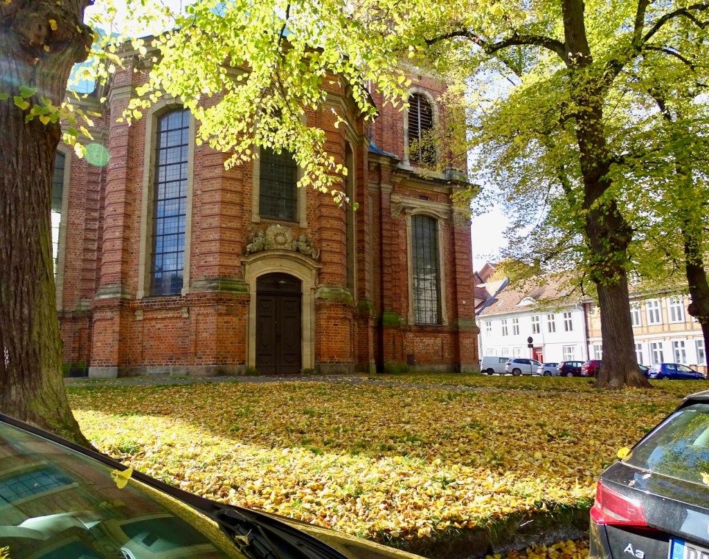 Parkkipaikan löytyminen on kaupunkien keskustoissa aina vähän haaste. Olemme usein ajaneet jonkun kirkon lähelle, koska tosi usein siellä on vapaita paikkoja silloin, kun ei ole tilaisuuksia. Näin nytkin. Auto jäi puiston reunalle.