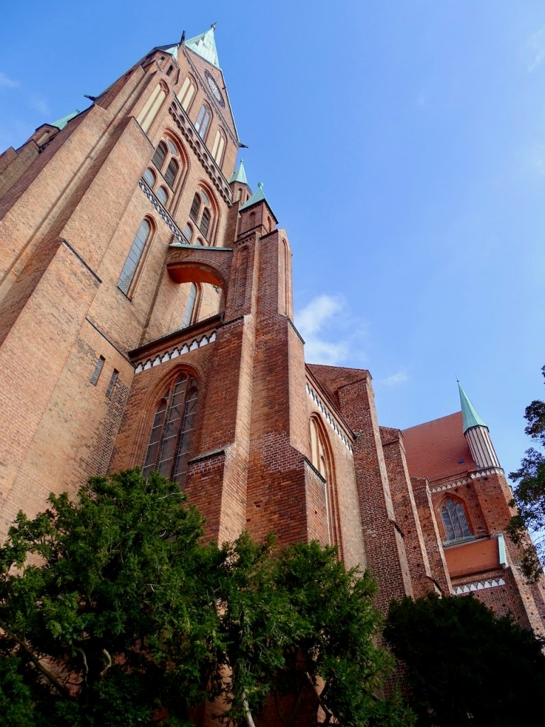 Schwerinin katedraali oli alun perin puusta rakennettu pyhiinvaeltajien kirkko, joka oli omistettu Pyhälle Marialle ja Joosefille. Vuonna 1222 kirkkoon tuotiin Jerusalemista pisara Kristuksen verta, jota ihmiset palvoivat pyhäinjäännöksenä. Vanha romaaninen kirkko kävi pian pieneksi pyhiinvaeltajille ja paikalle rakennettiin uusi katedraali, josta tuli yksi Pohjois-Saksan tärkeimmistä pyhiinvaelluspaikoista. Torni on valmistunut vasta 1800-luvun lopulla, ja se on Mecklenburg-Vorpommernin korkein kirkon torni, 117,5 metriä. Torniin kannattaisi kiivetä, koska näkymä kaupunkiin, järville, linnalle ja ympäröivälle maaseudulle olisi upea eivätkä nuo 220 askelmaa mitenkään ylivoimaisia olisi. Ensi kerralla sitten.