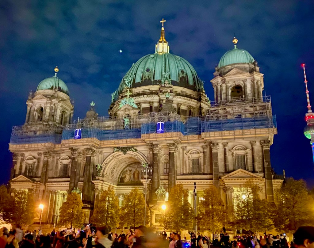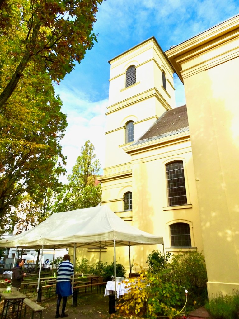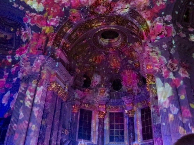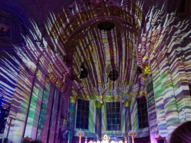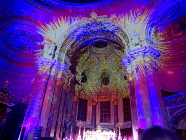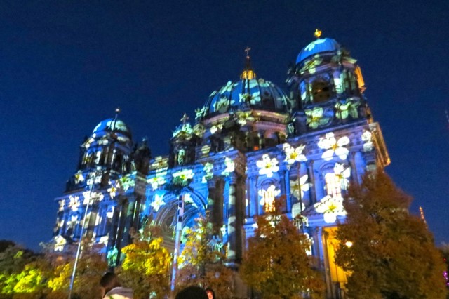 Yksi hienoista ja näyttävimmistä valoesityksistä jäi meiltä näkemättä, kun olimme Berliinissä vasta loppuviikosta. Charlottenburgin linnalla oli aivan uskomaton valoshow. Majapaikkamme oli kävelyetäisyydellä sieltä ja sunnuntai-aamupäivällä suuntasimme sinne. Ensin pistäydyimme lähellä jumalanpalveluksessa ja istahdimme kirkon viereen kirkkokahville, jossa saimme jälleen kerran kertoa Suomesta ja matkoistamme niitä ihmetteleville berliiniläisille, joista kukaan ei ollut käynyt Suomessa. Tällainen on aina hauskaa.