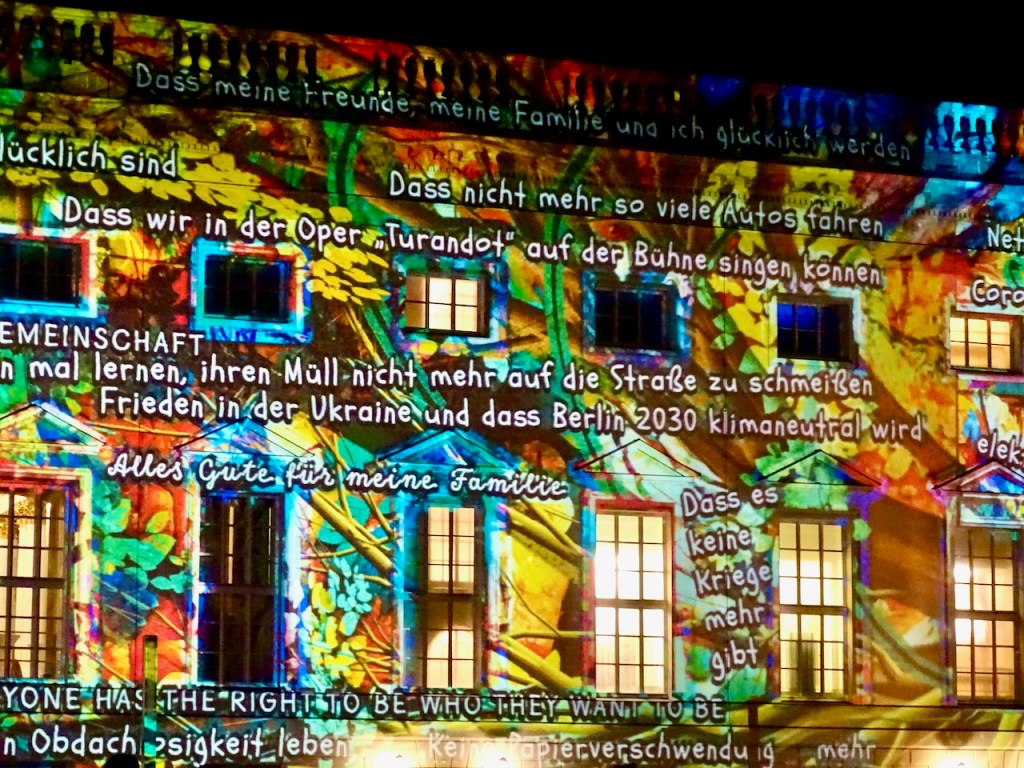 Vuoden 2022 Berliinin FESTIVAL OF LIGHTS oli valinnut aiheekseen: Vision of our Future ja valoteokset toivat eri tavoin esiin näitä visioita. Toinen periaate tänä vuonna oli energian säästö. Festivaalin omilla sivuilla kerrotaan valtavasta energian kulutuksen vähentämisestä. Kulutusta oli pystytty vähentämään jopa 75%.