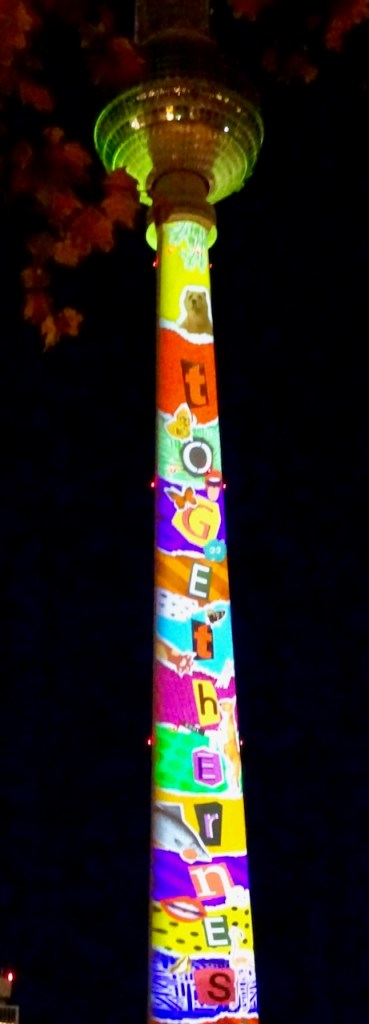 Tässä valoteos, jota katselimme ennen videoshow-esitysten alkamista Alexanderplatzilla. Energiansäästö 100%.