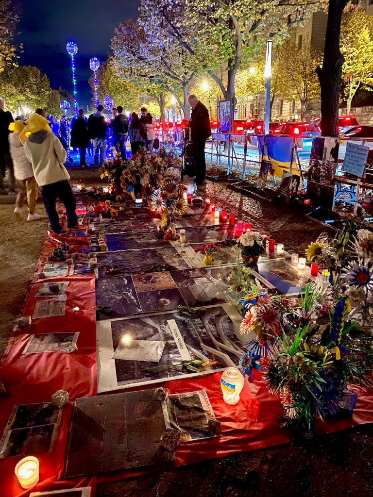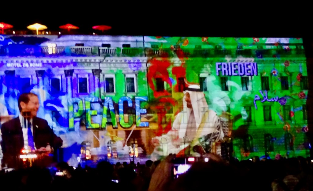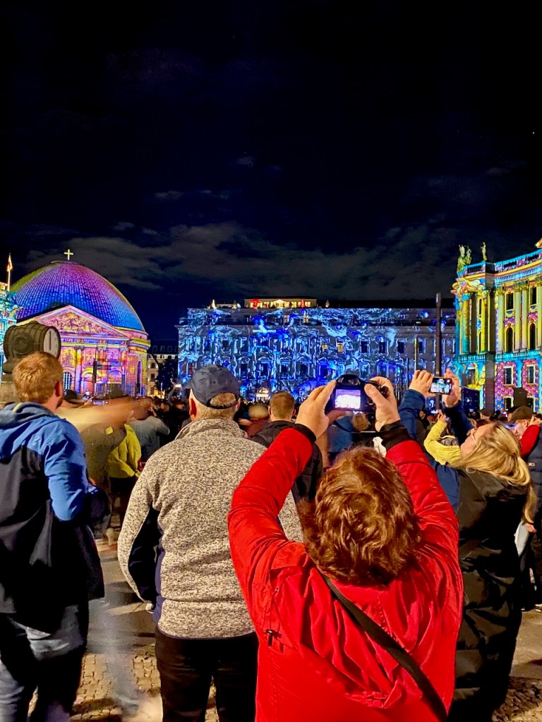 Kaikkein näyttävin ja käsittämättömän upea oli Bebelplatz, jossa aukiota reunustivat valaistuina Ooppera, Pyhän Hedwigin katedraali, Oikeustieteellinen tiedekunta ja Hotel de Rome. Aukio oli koko ajan tungokseen asti täynnä ja kameroita oli pystyssä kaikilla. Täällä vain Hotel de Romen seinillä oli vaihtuvaa kuvaa, muut pysyivät paikoillaan ja Oopperan seinillä oli aiheeseen liittyviä tekstejä.