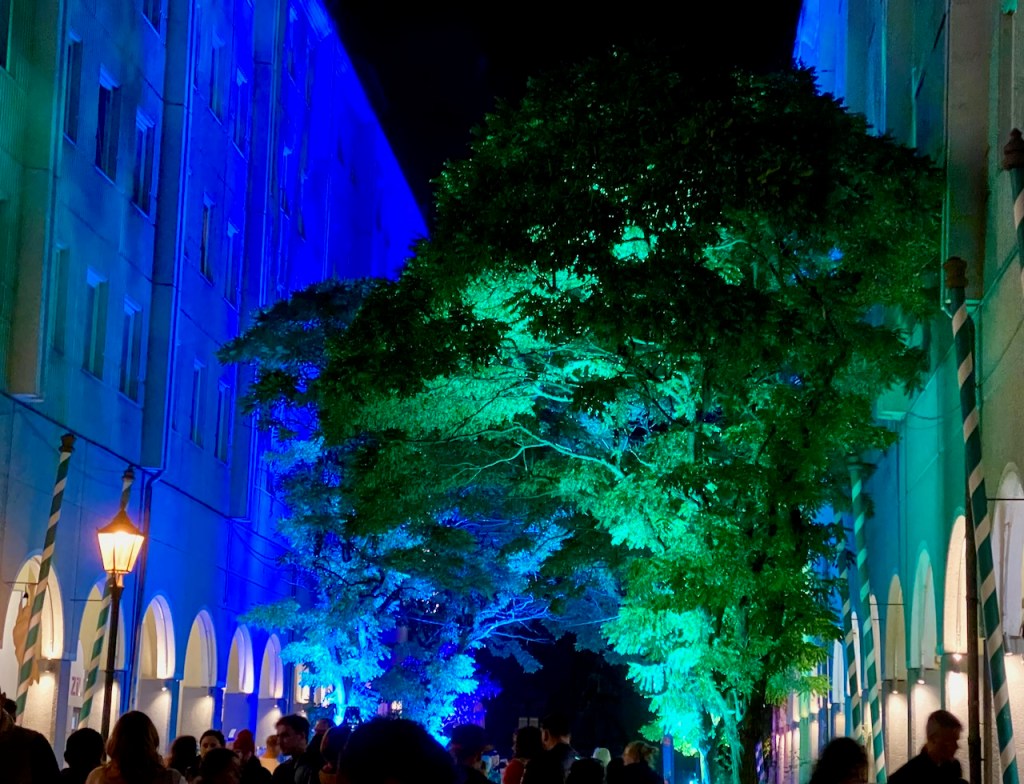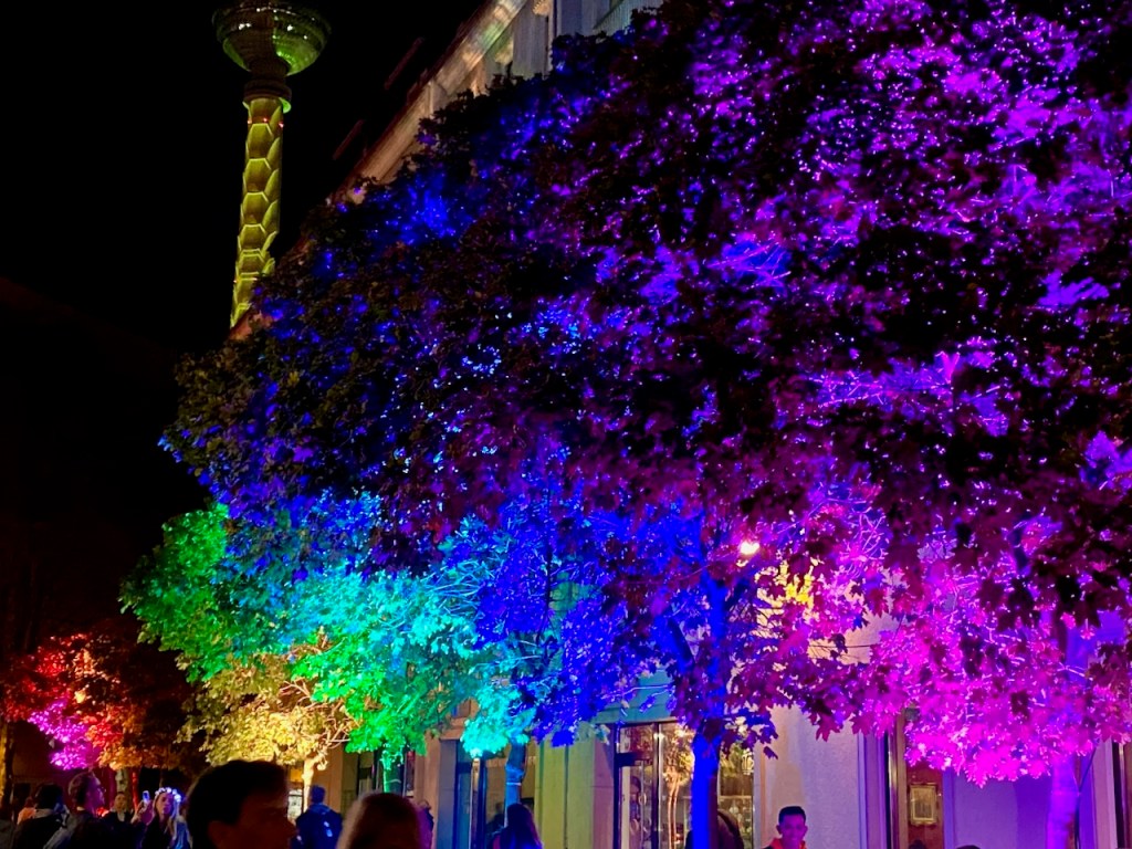 Nikolaiviertelin esitykset olivat hyvin toisenlaiset kuin Brandenburgin portin. Ei videoita vaan valoja ja valaistuja esineitä puita, joiden valaistus vaihtui koko ajan.