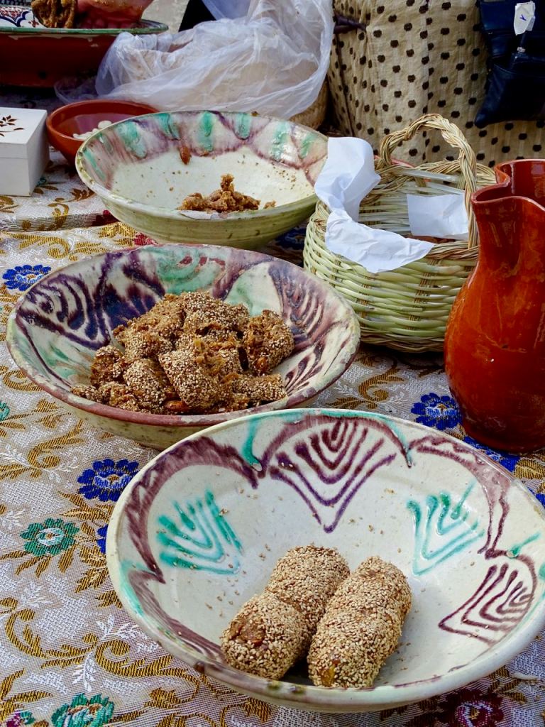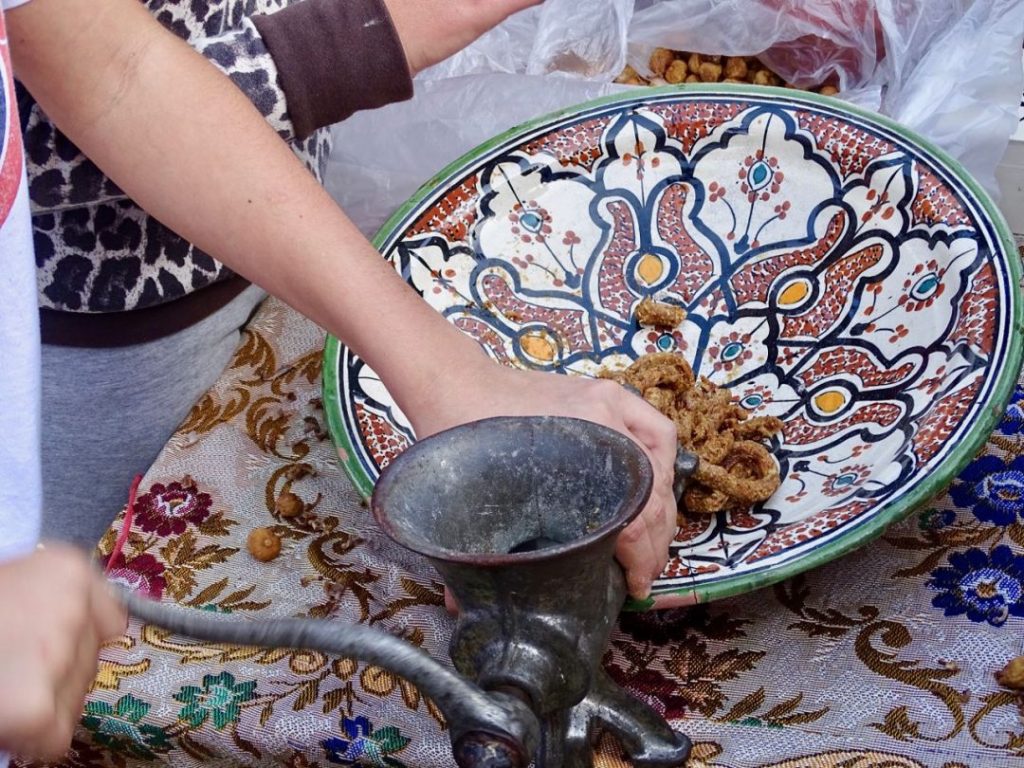Innokkaat pikkukädet nostelivat viikunoita ja manteleita myllyyn ja kukin vuorollaan sai jauhaa niistä vähän epämääräiseltä näyttävää mössöä. Mausteeksi tuli anista.